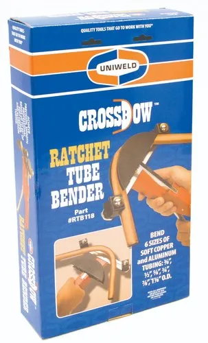 Uniweld’s CrossBow™ Ratchet Tube Bender enables plumbers and HVAC/R technicians to make precision bends up to 90° with soft copper and aluminum tubing. The low friction mandrels and rotating side support blocks provide precision bending in confined spaces. Bend tubing sizes: 3/8″, 1/2″, 5/8″, 3/4″, 7/8″, 1-1/8″ O.D. You can produce bends with minimum distortion for optimal flow. Repeated alternate angles bends are possible with the CrossBow™ Ratchet Tube Bender, housed in rugged plastic carrying case.